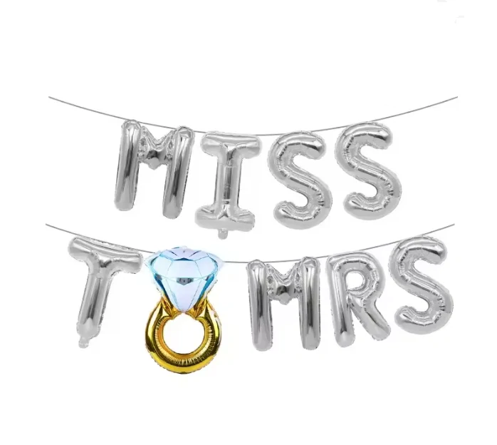 Perfektní doplněk na rozlučku se svobodou! Sada obsahuje nápis „MISS TO MRS“ ve formě fóliových balónků, ikonický balón ve tvaru zásnubního prstenu, stuhu a brčko pro snadné nafouknutí.